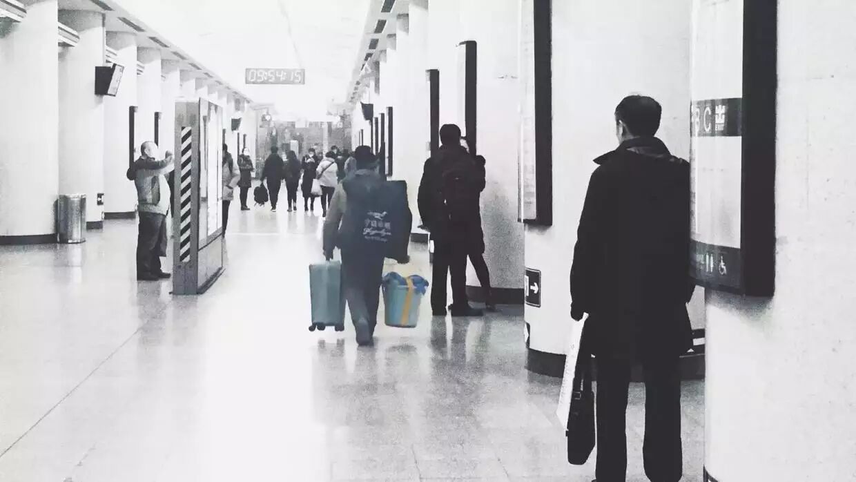 他四处张望,在找寻正确的乘车讯息,脚却始终往前走着。